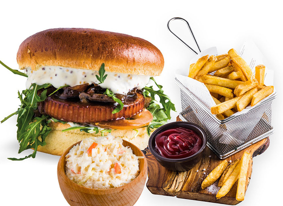 200g wołowiny, ogórek, sałata, cebulka prażona, sos Remulada, majonez z ketchupem, 2x ser Cheddar, buła maślana z sezamem. Burger jak dawnej z lat 90-tych w nowej odświeżonej wersji, w zestawie z domowymi frytkami i sałatką coleslaw.